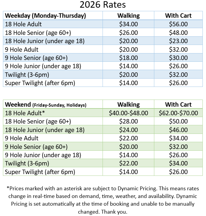 Our weekend (Friday-Sunday and holidays) rates are determined by dynamic pricing, a model that refers to aligning the price of tee times in real-time based on various factors such as demand, time of day, day of the week, weather and other conditions. Similar to your experience in booking a flight or hotel or buying tickets to a concert or sporting event, this means that the price of a tee time can change depending on when you want to play and how popular that time is with other golfers. With rates changing daily, this buying experience helps you pick the date, time and price that best suits your needs.